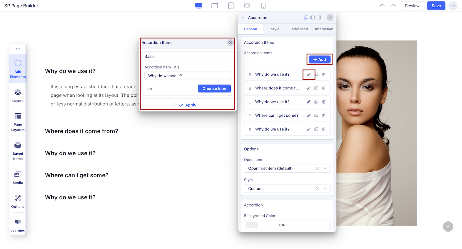 Add Accordion Items: Click on the + ADD button to add a new accordion item. Once you add an accordion item, you will see the options to edit, duplicate, or delete the accordion item.