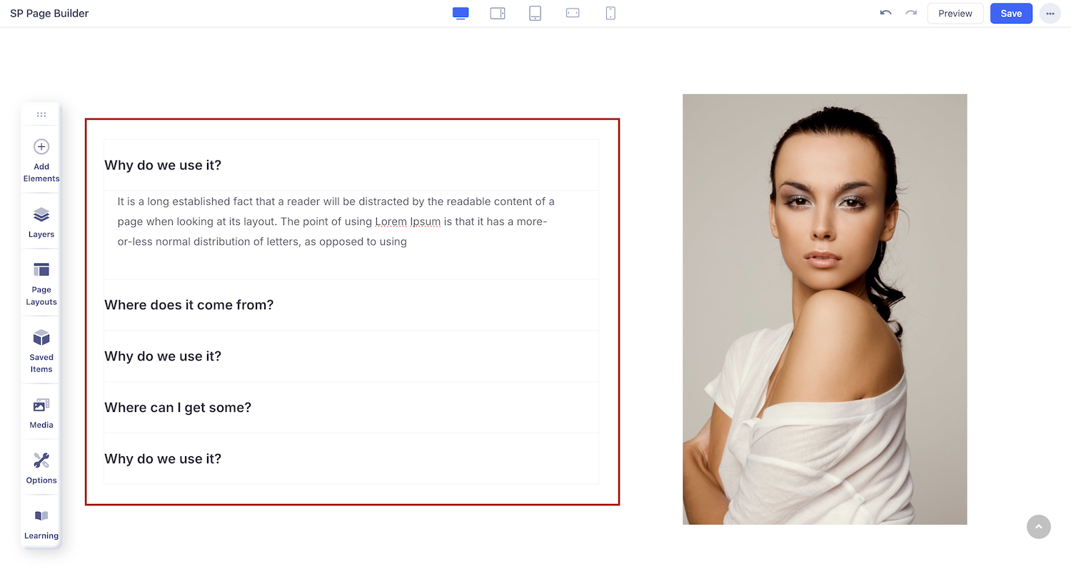 You can add an accordion addon to your page from the SP Page Builder sidebar. Simply drag the addon from the Addons panel and drop it on the section of the page where you want to add an accordion.