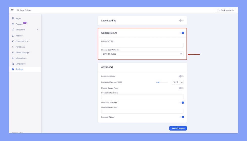 Once you've got your API key. Next, go to SP Page Builder 5 Admin > Settings > Generative AI.