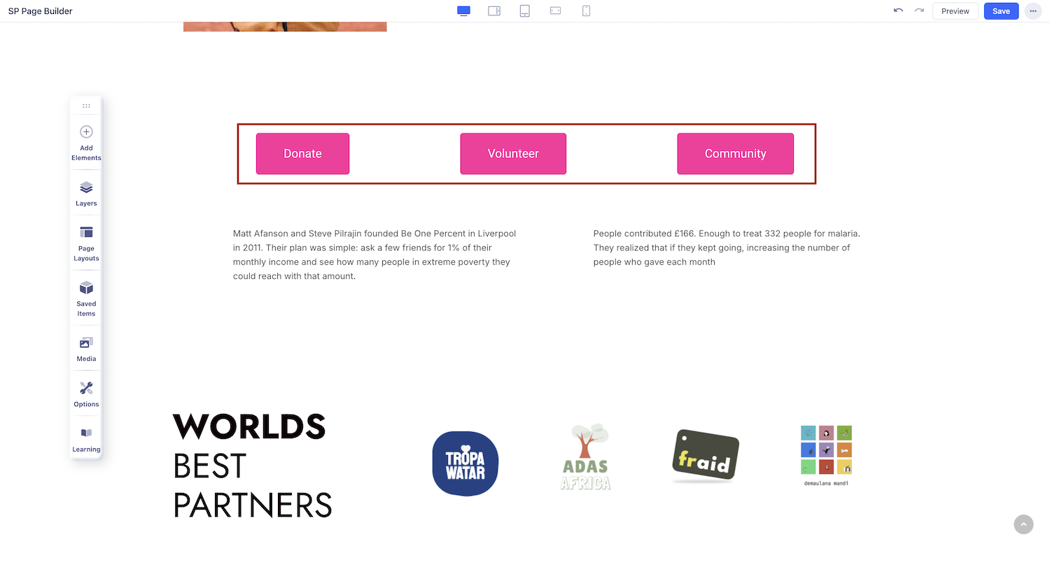 You can add the Button Group addon to your page from the SP Page Builder sidebar. Simply drag the addon from the Addons panel and drop it on the section of the page where you want to add multiple buttons together.