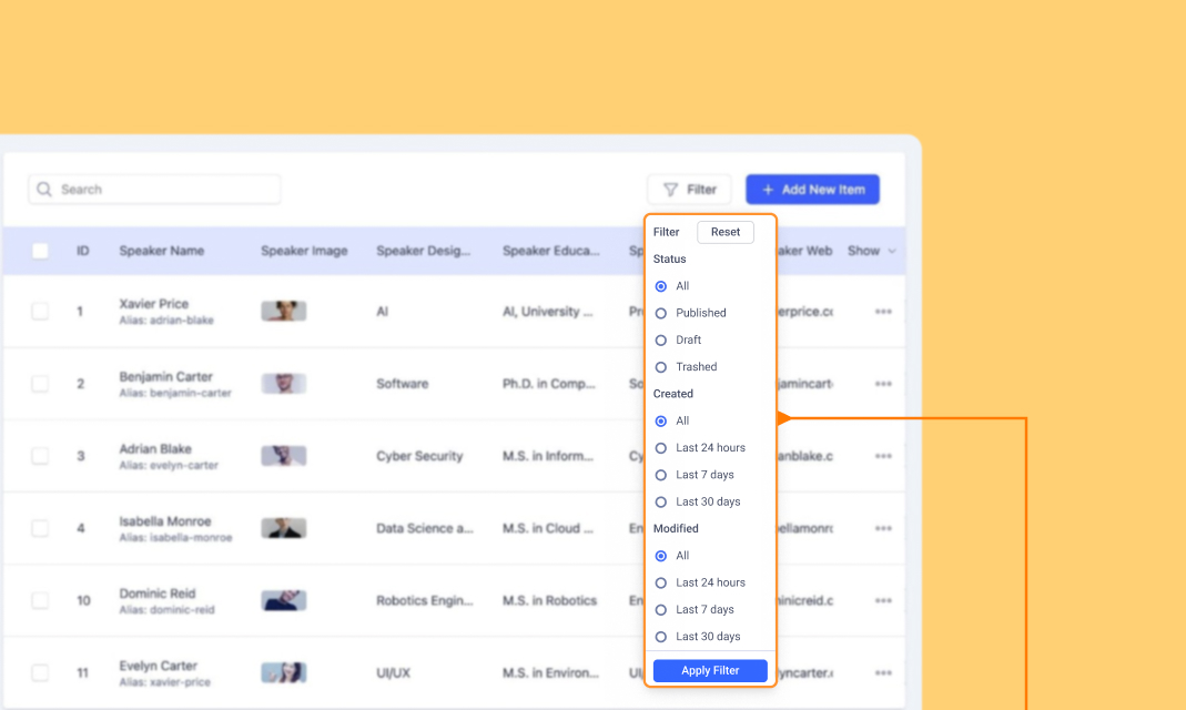 Quickly locate specific entries using filters. You can filter collection items based on:
