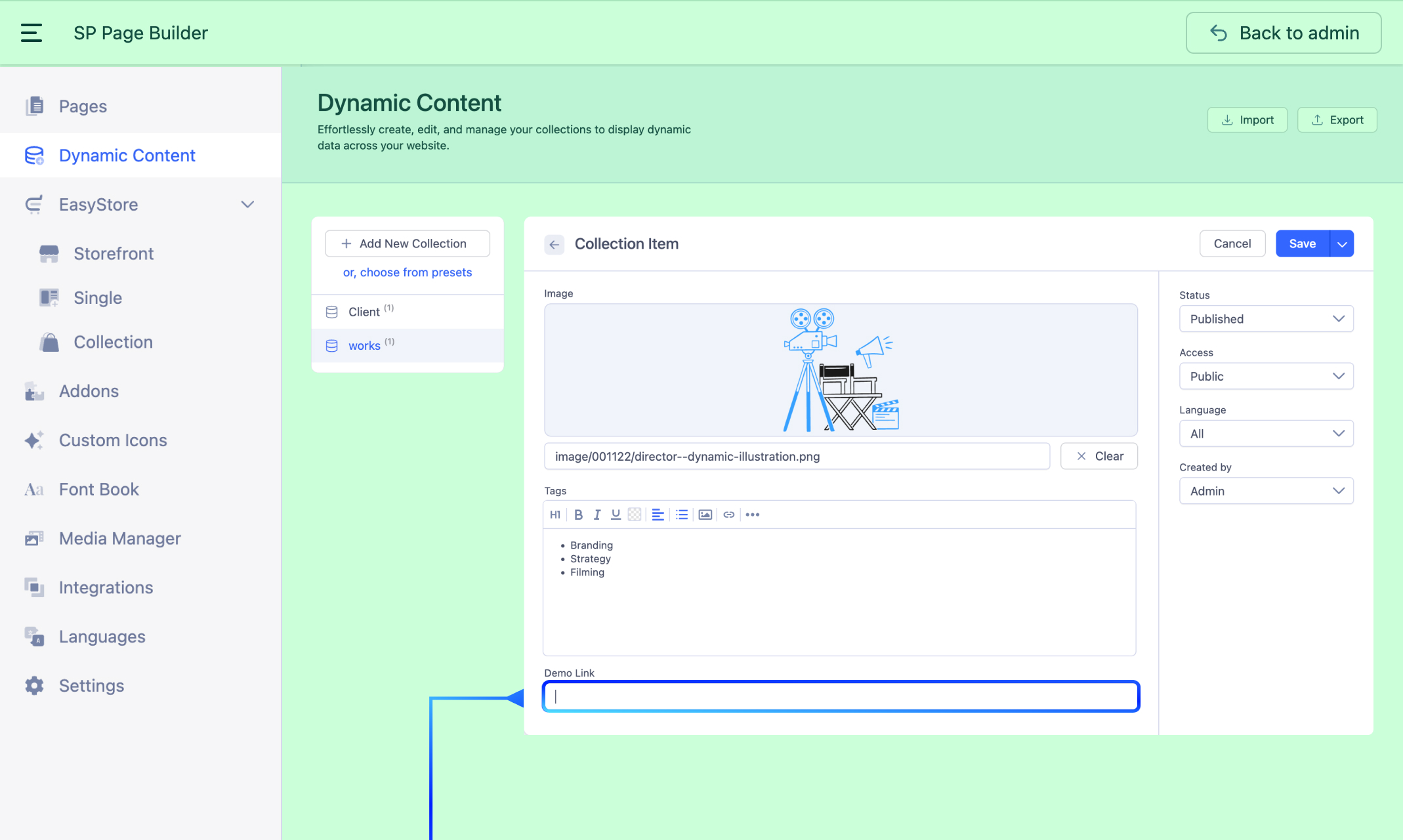 4. Set the Collection Source to the one that includes your Link field. For example, we'll set the source to "Works", since the Link fields are included within the Works collection.