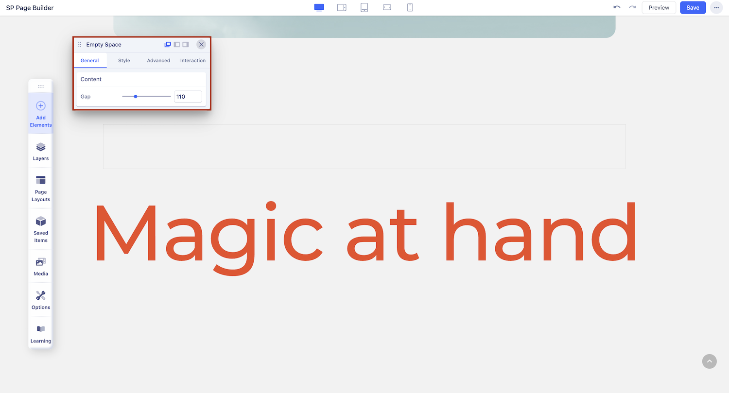 To add the Empty Space addon, click on the addons button on the Sidebar to open the Addons Panel. Here, you’ll find the Empty Space addon under the General section. Drag and drop this addon where you want to place it on your page.