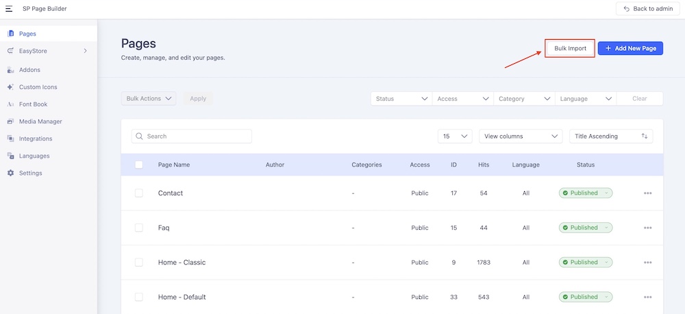 Within your SP Page Builder dashboard, you'll notice the Bulk Import option conveniently located beside the “+Add New Page” option. Simply click on it to initiate the process of importing your saved pages directly from your device. Please note that pages should be imported in zip format from SP Page Builder.