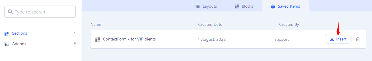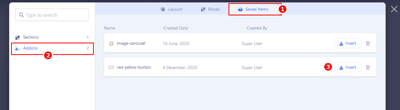 In SP Page Builder 5.x click Layouts > Saved Items (1) > Addons (2) > Select item and then click Insert button (3).