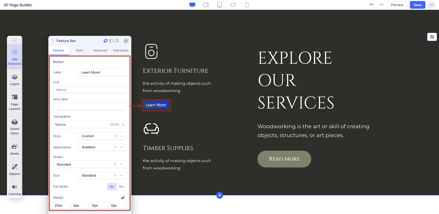 Use this setting in case you want to set a button inside your Feature Box. The Button Settings comes with all the options necessary to create a fully customized button.