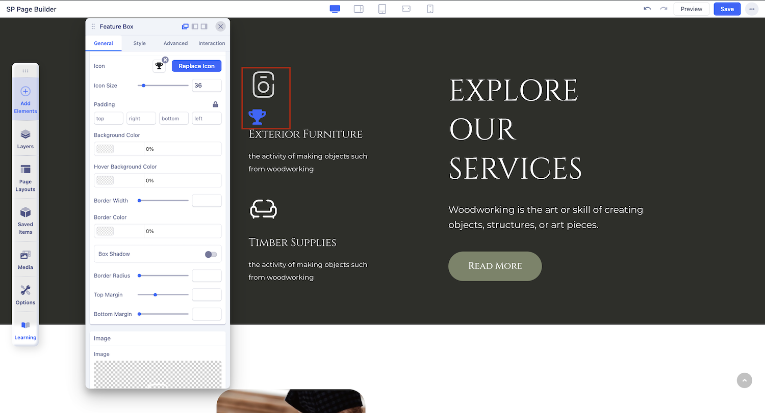 Position: Choose the position where you want to set your chosen image and icon in the Feature Box. Choose from a dropdown list of different options.