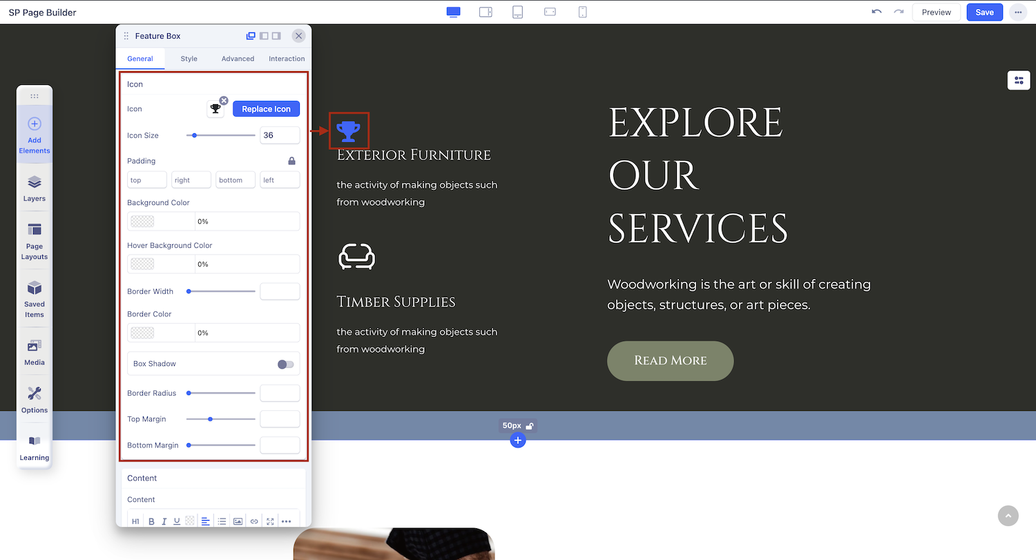 Position: Choose where you want to position your chosen icon in the Feature Box.