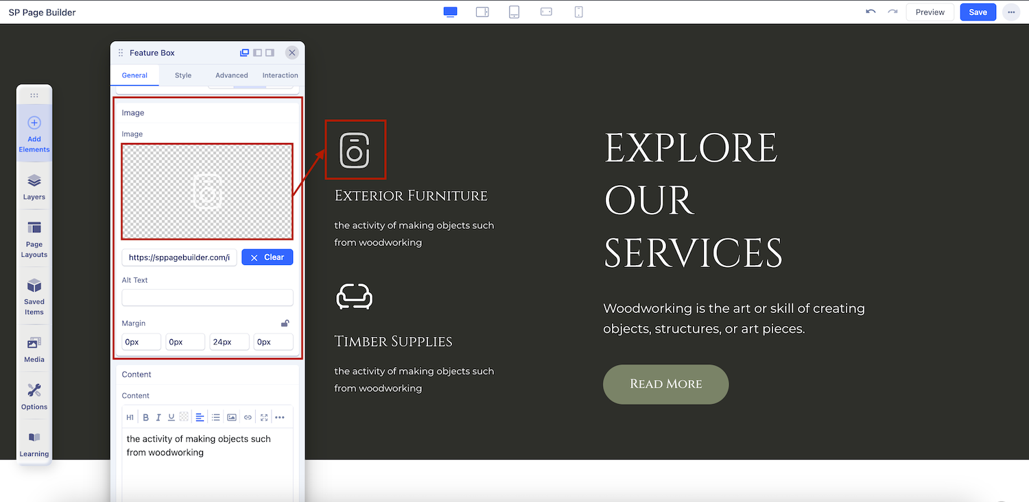 Choose this option if you want to set an image in your Feature Box. Image media type comes with the following settings: