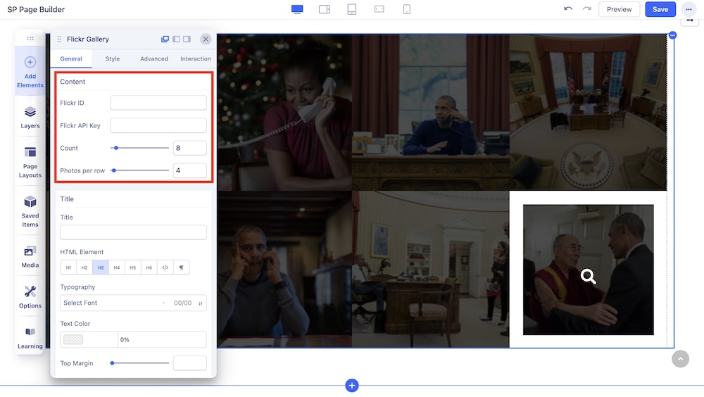 SP Page Builder comes with the powerful Flickr Gallery addon for you. Use the Flickr Gallery addon so that you can display an unlimited number of images with Flickr Gallery.