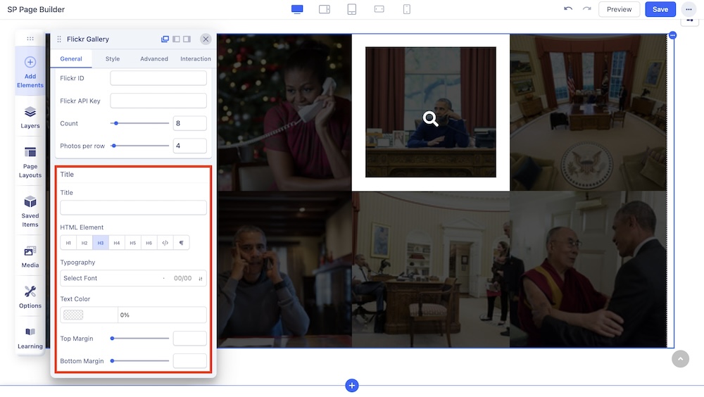 Photos per row: Set how many images you want to display in each row within your Flickr Gallery Addon.