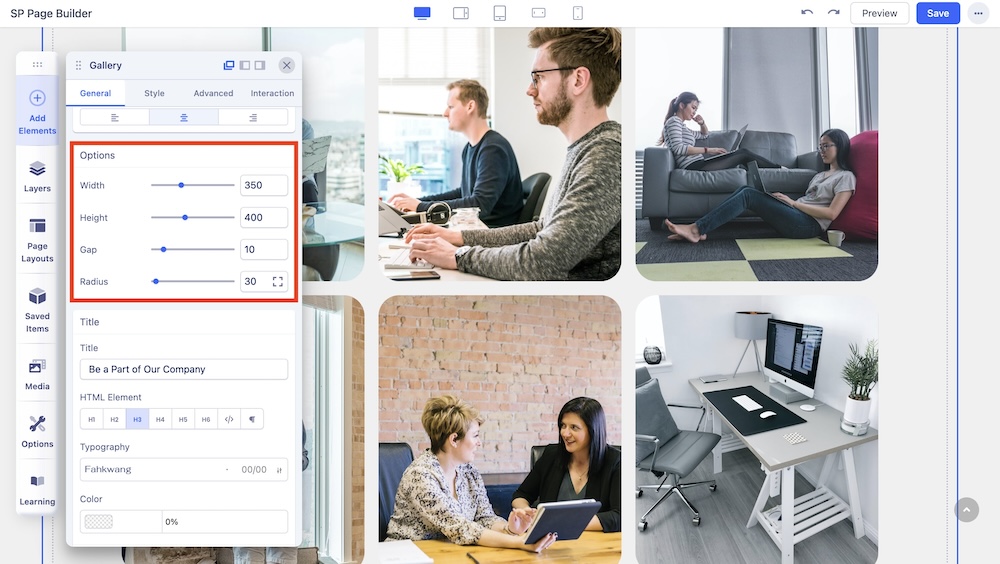 SP Page Builder Gallery Addon is designed for a gorgeous-looking image gallery output. You can add thumbnails for your images and upon clicking the thumbnails the image pops up.