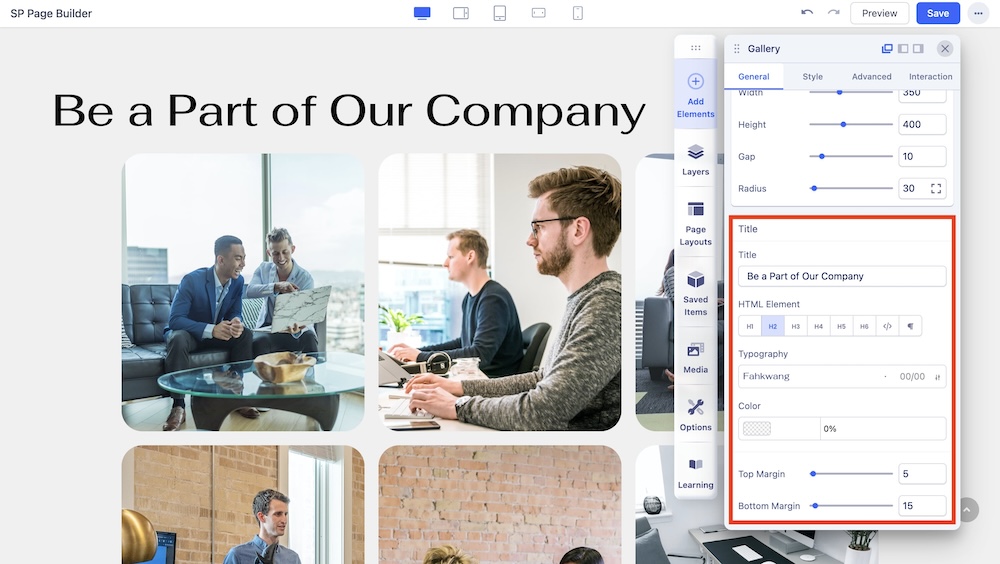 Bottom Margin: Adjust the bottom margin of the Gallery.