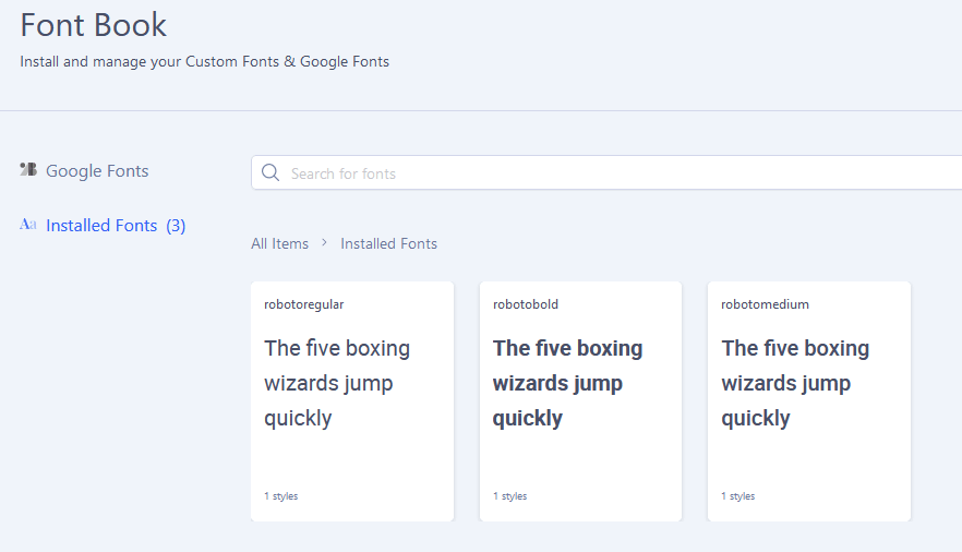 If you cannot upload/install the font zip package, check PHP settings, especially the memory_limit setting, for example, you should have 128M, 256M, or 512M values.