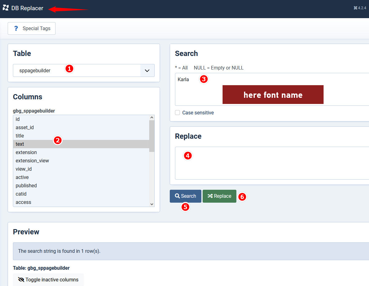 You can also delete font names from a database, for that task, you can use the Free version of DB Replacer (from RegularLabs). In the below example, we searched only inside sppagebuilder Table. An example "Karla" font name. In your case copy the font name from the HTML name use it inside the Search field and replace it with empty space. Follow 1-6 steps from the screenshot.