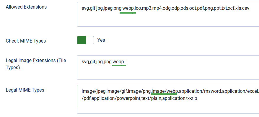 Add webp in Allowed Extensions, you can replace bmp, which is not used anymore.