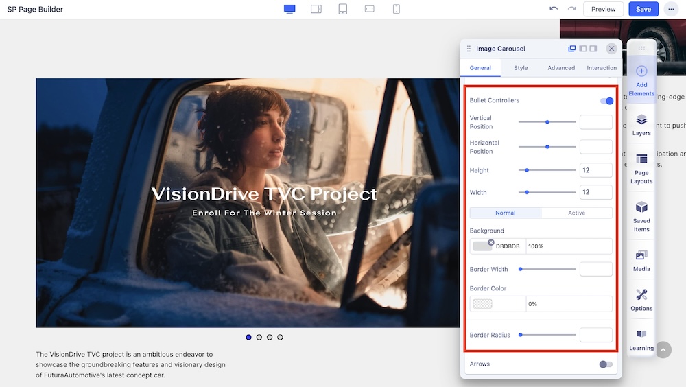 Bullet Controllers: Enable to show Bullets to slide the next item in the carousel. You can customize the position, width, height, color, border, and more of the bullet controller from the settings.