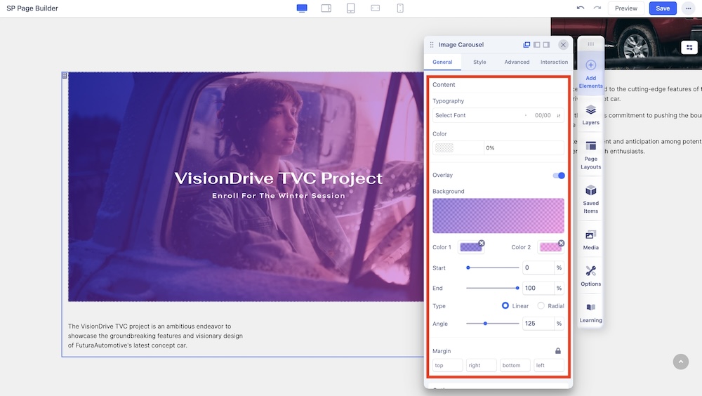 Layout: You can showcase your image carousel in 4 different layouts. Select your desired carousel layout and customize it your way. 4 of these carousel layouts vary on the basis of their image positioning. Each of these layouts is unique and has its own design needs.