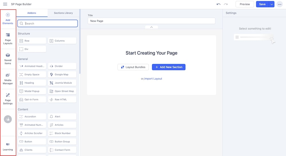 The editing interface of the backend editor comes with a Main Menu Bar that contains Add Elements, Page Layouts, Saved Items, Media Manager, Page Settings, Clipboard Cleaner, and Learnings. You can carry out all your major activities like adding SP Page Builder addons to your created sections, accessing existing layout bundles & previously saved items, etc from this main menu bar.