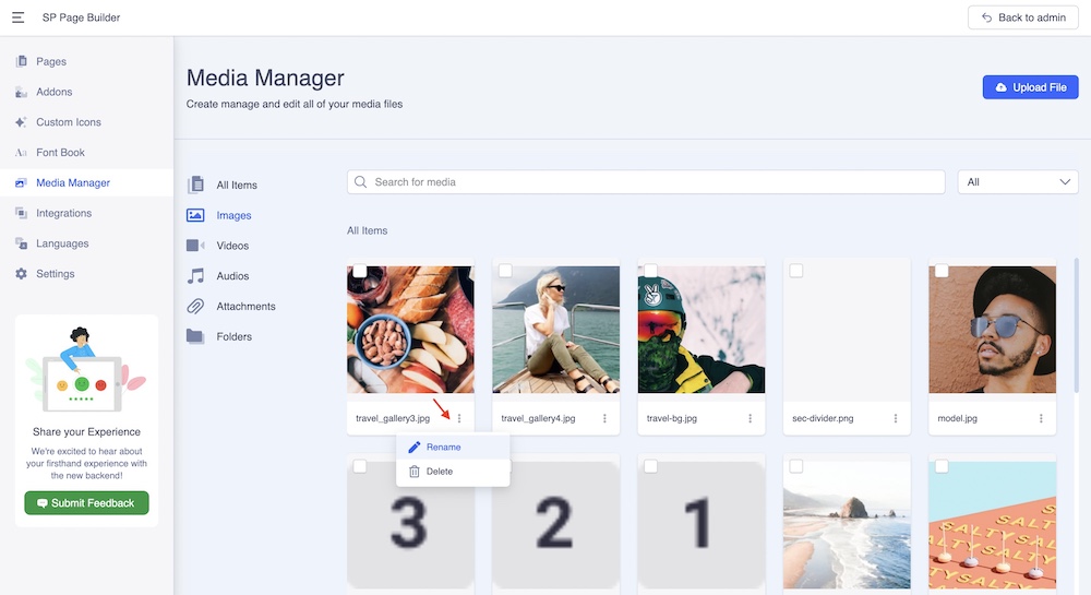 Easily rename or delete an image by simply clicking on the vertical three-dot icon beside each image. You can also search for a specific media using the search field or filter files by date.