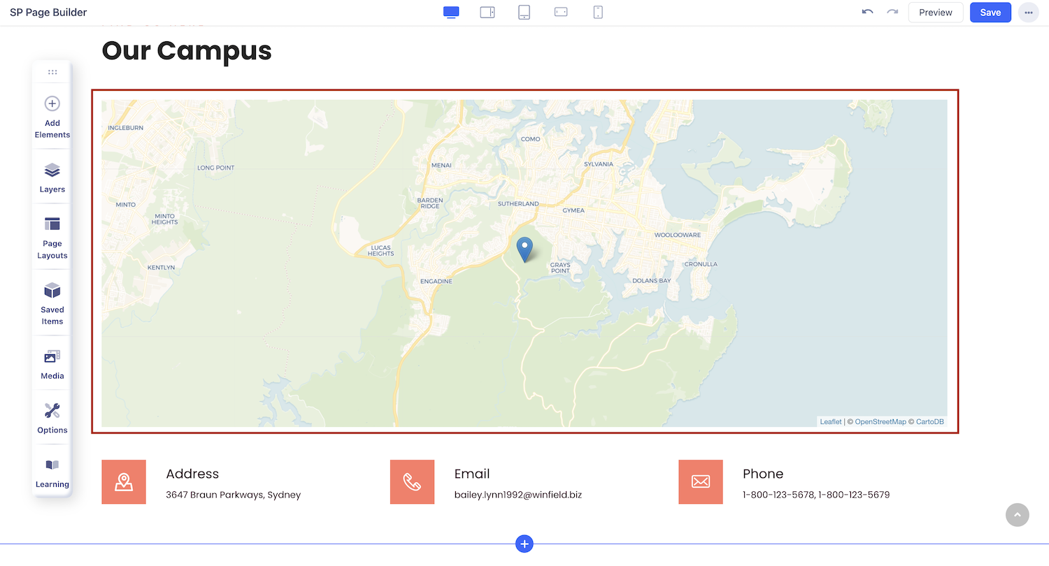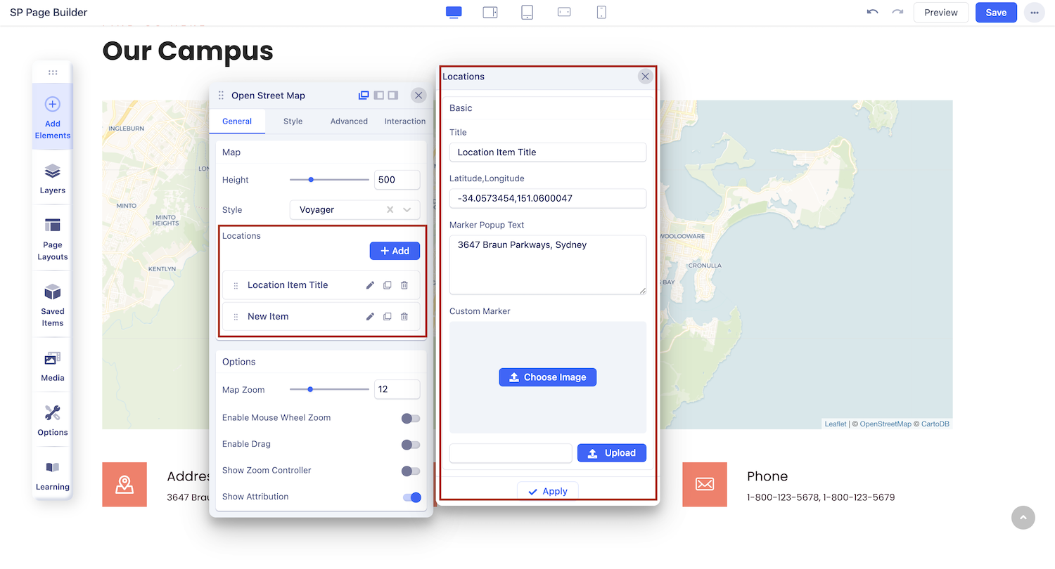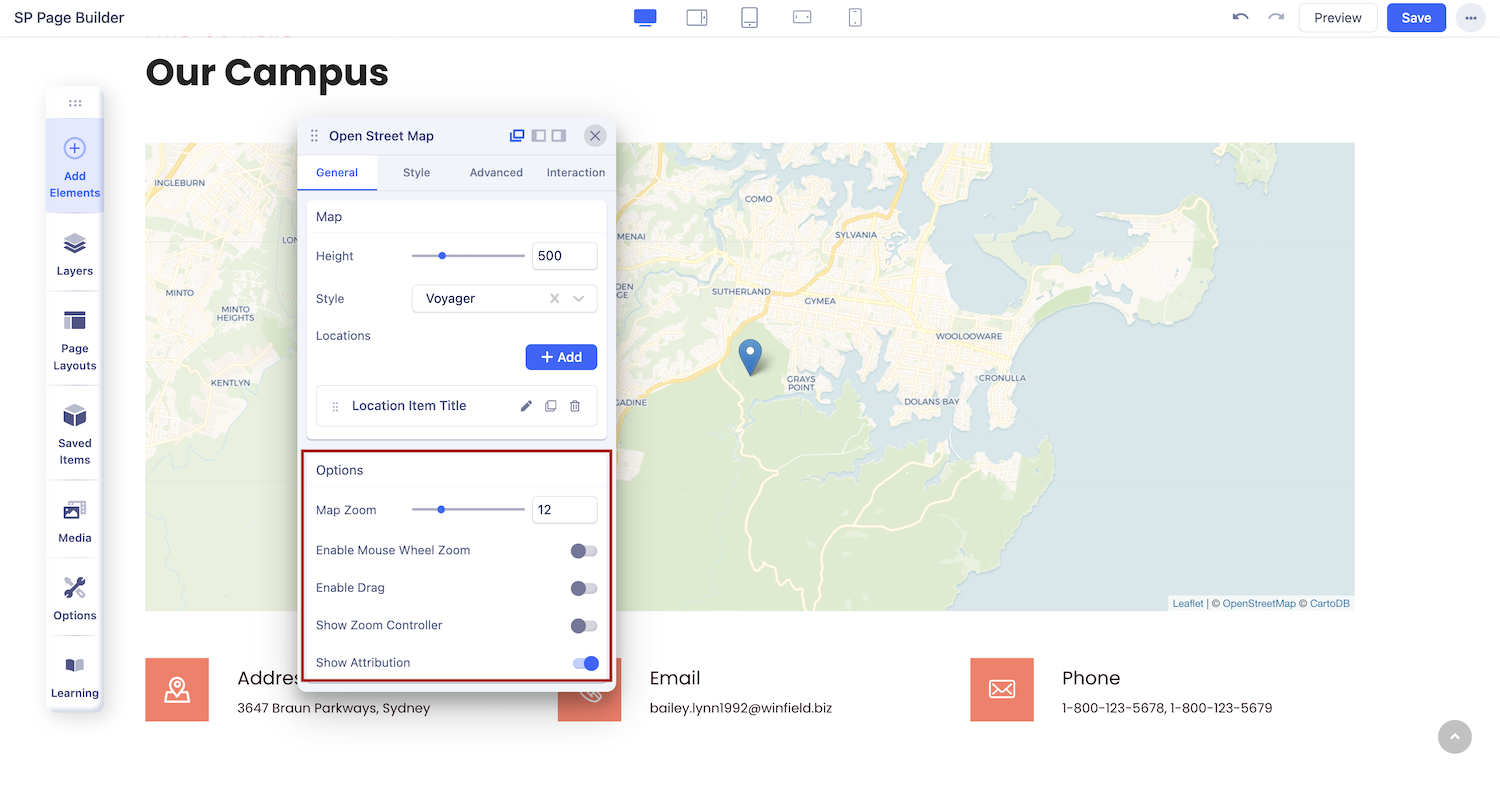 You can add the Open Street Map addon to your page from the SP Page Builder sidebar. Simply drag the addon from the Addons panel and drop it on the section of the page where you want to add the Open Street Map.