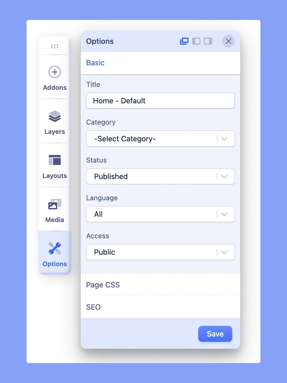 SP Page Builder’s page settings have a lot of handy settings that lets you manage the page’s language, access level, page CSS, SEO settings, and more.