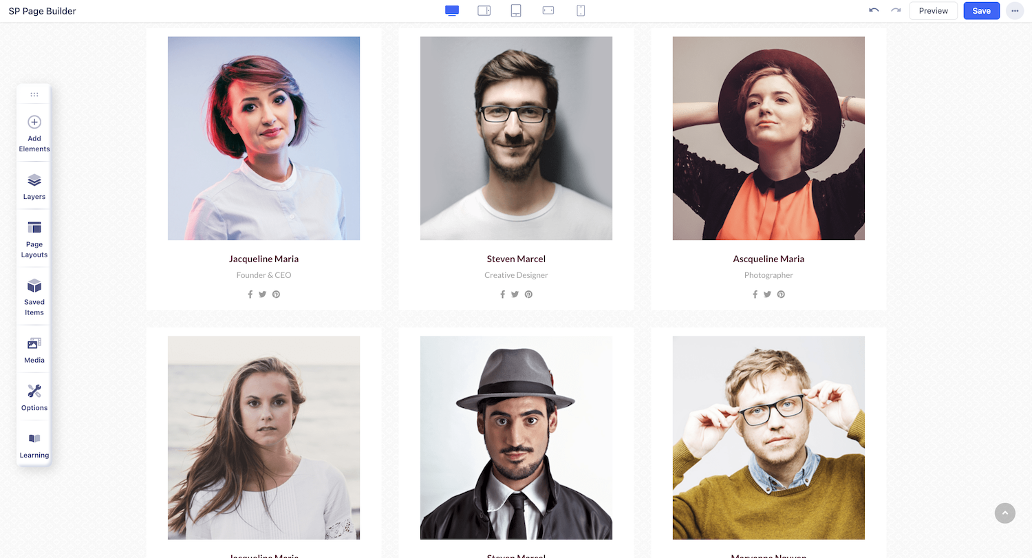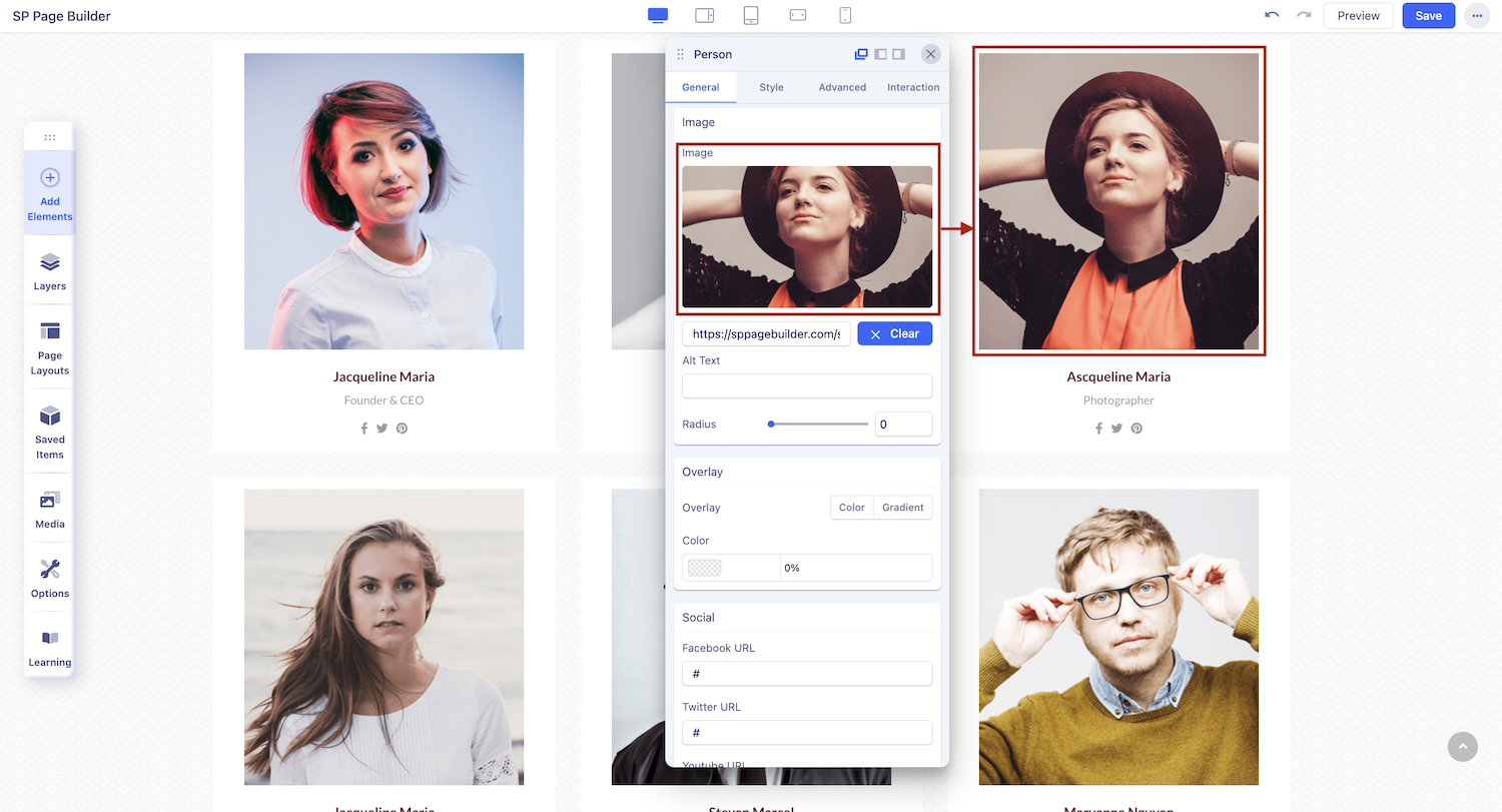 You can add a Person addon to your page from the SP Page Builder sidebar. Simply drag the addon from the Addons panel and drop it on the section of the page where you want to add a Person addon.