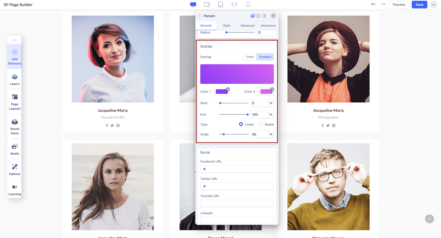 Switch between the Overlay tab options (Color and Gradient) to edit and customize the hover color of your addon.