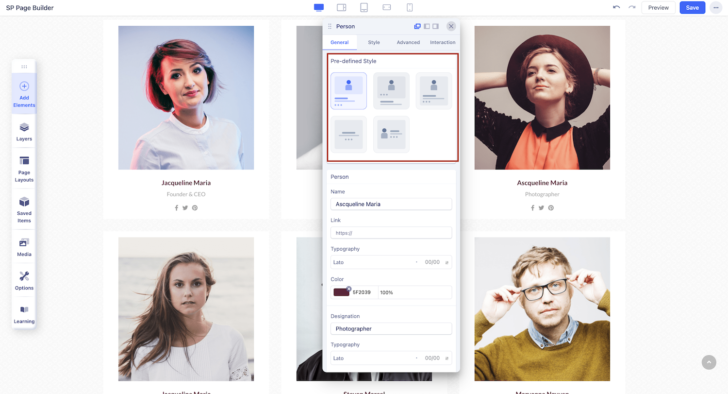 Select the perfect layout for your Person addon from 5 distinct options using the pre-defined templates.