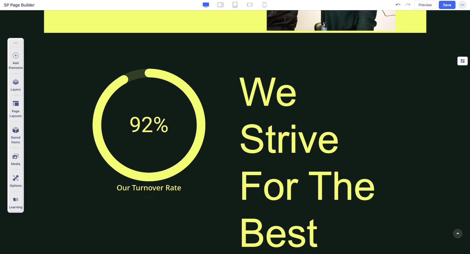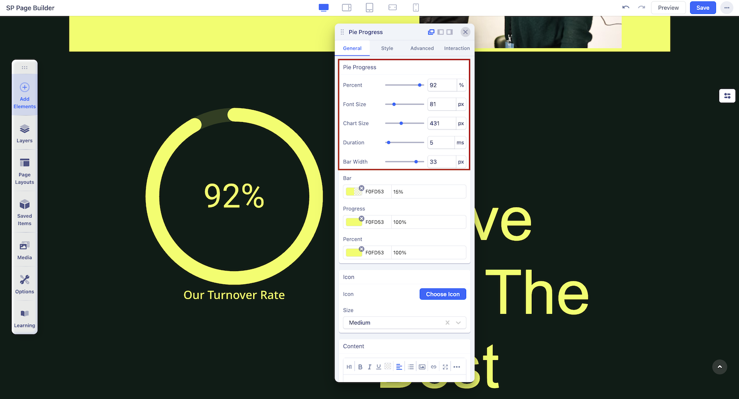 As usual, to add a Pie Progress, open the Addons Panel from the Sidebar or by clicking on the plus icon at the center of a row. You’ll find the Pie Progress addon under the Content section so drag and drop this to your canvas.