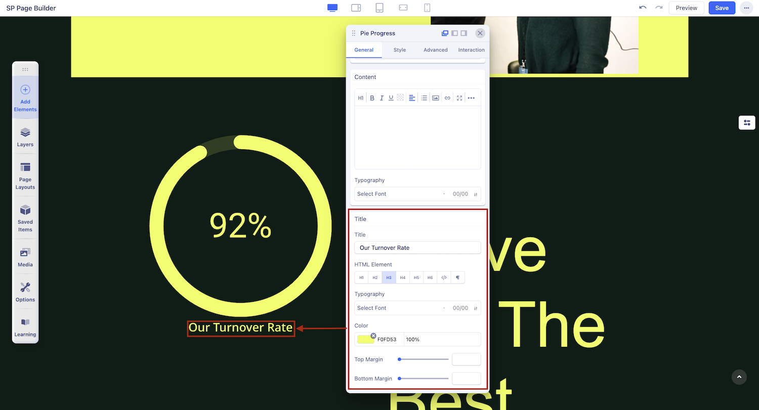 Click on the ‘A’ Letter icon on the inline editor to open the Typography window. Here, you can adjust the Font, Font Size, Line Height, etc for the text in your Pie Progress. For detailed information on Typography check out this documentation.