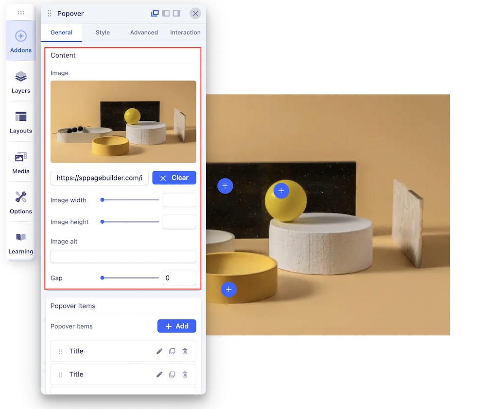 Gap: Set the gap between the uploaded image and other popover items for precise spacing control.