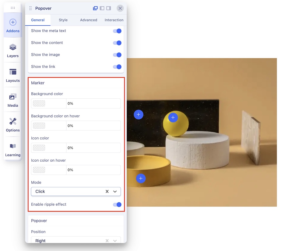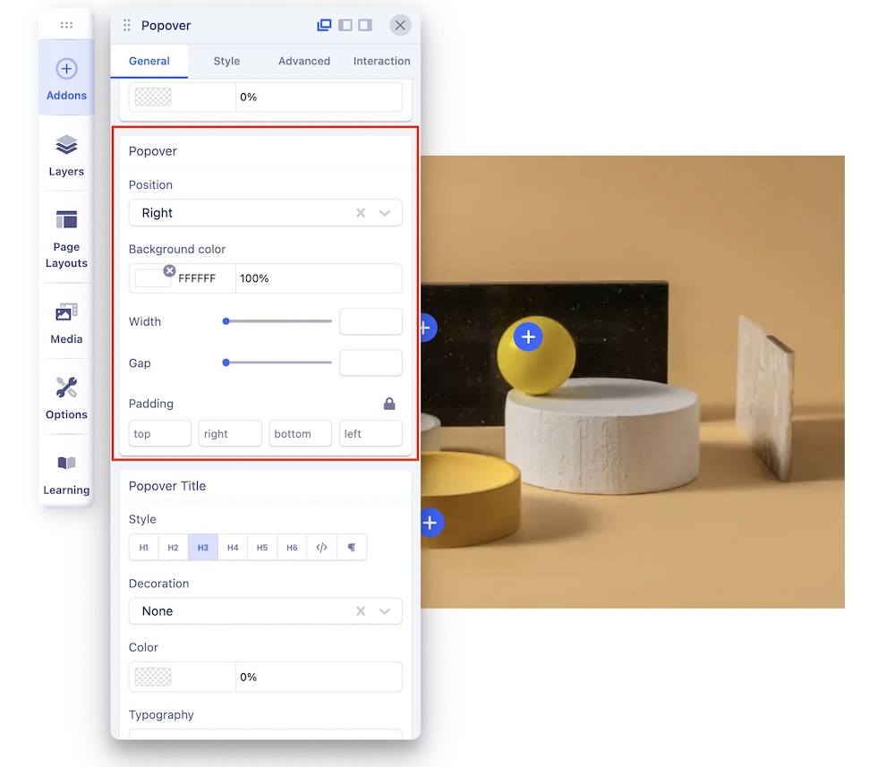 You can set the color, typography, padding, and margin for the Popover itself, Popover Title, Popover Meta, Text Content, and Popover Link,