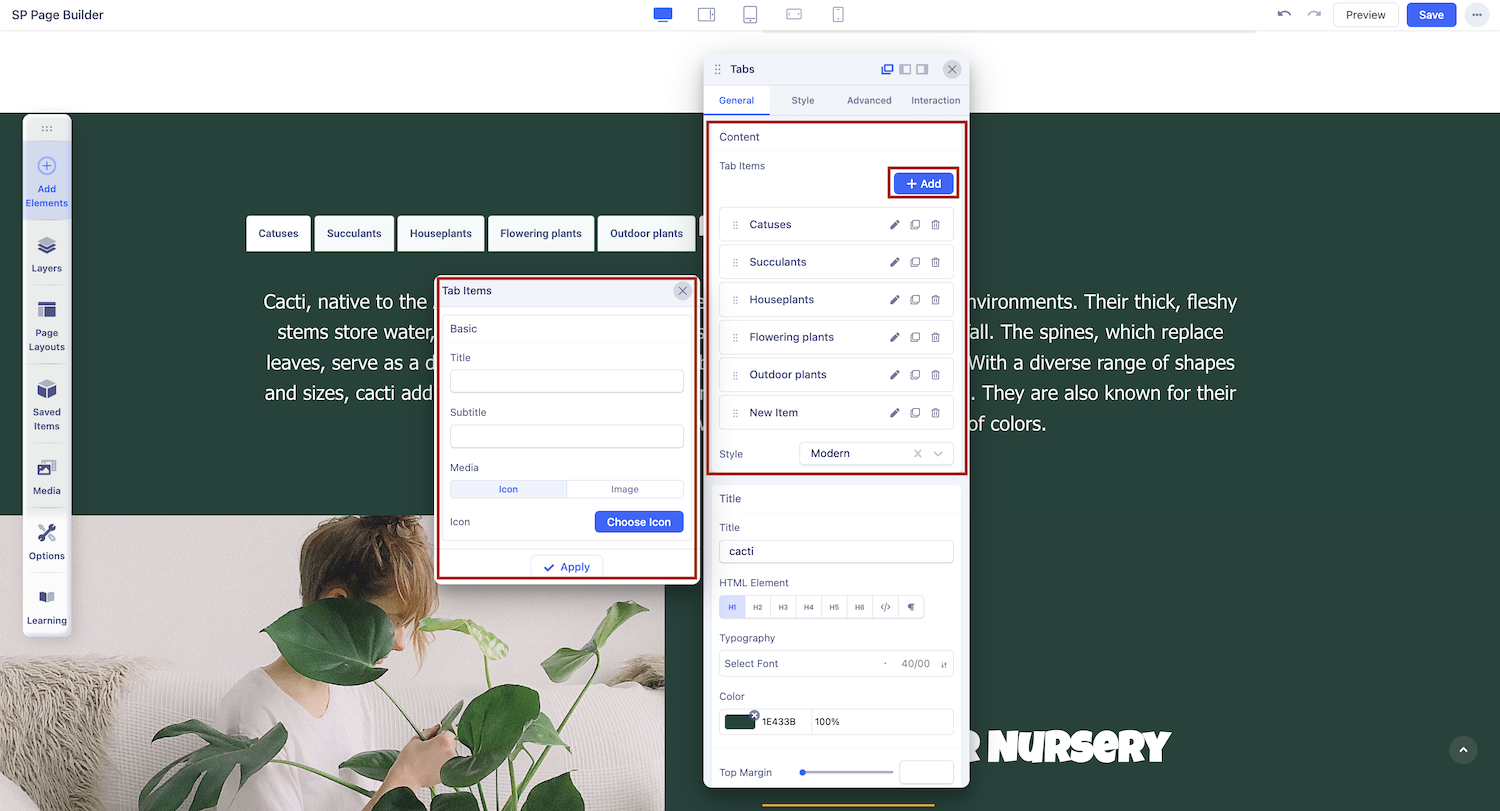 After adding the Tabs Addon to your page, simply click on it to access the settings panel, where you can customize its appearance and functionality to suit your needs.