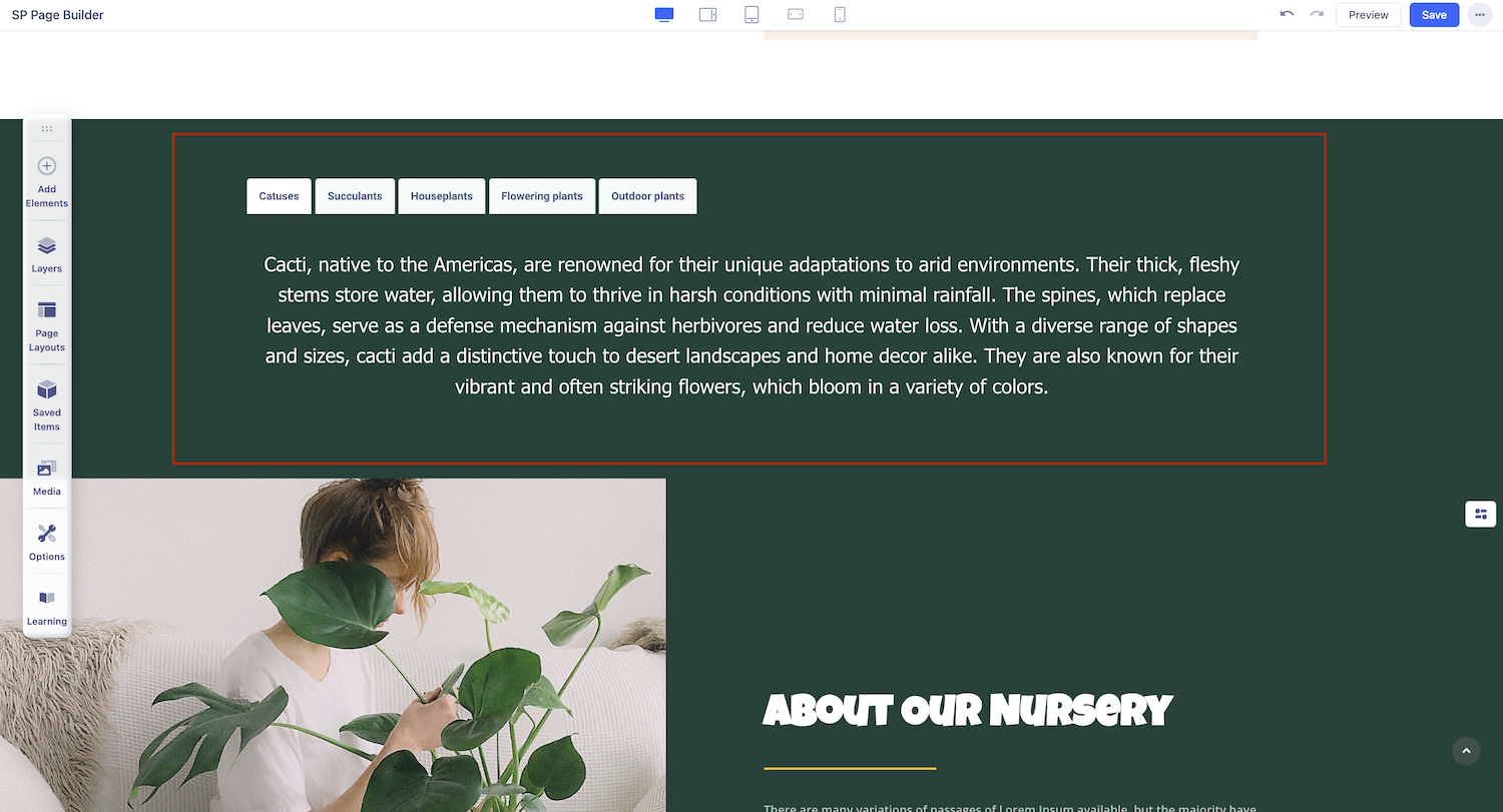 Start by opening the Addons Panel. Click on the Addons button on the Sidebar or the plus icon inside a row to do this. Finally, scroll down to the Content section and drag & drop Tabs to your canvas.