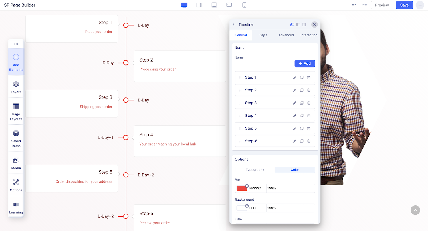 To start, open the Addons Panel by clicking on the plus icon inside a Row or the Addons button on the Sidebar. Scroll down to the bottom of the Content section to find the Timeline addon. Finally, drag & drop this where you want to place it on your canvas.