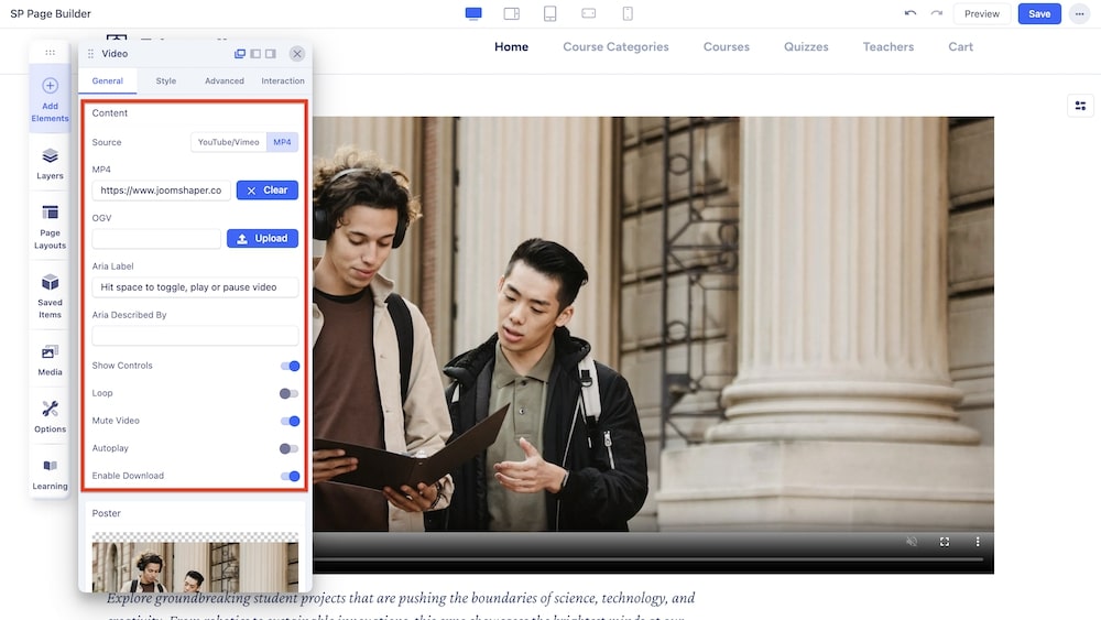 The poster feature is available for self-hosted videos only. Thus, it is not available if your source is a YouTube or Vimeo video.