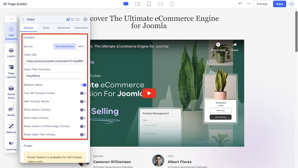 You can easily add your Youtube/Vimeo clip and mp4 to any page using the Video addon of SP Page Builder.
