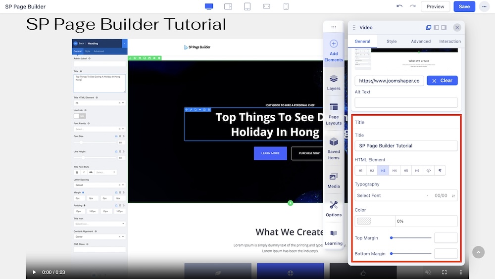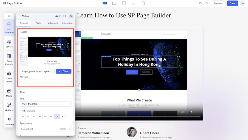 You can add the Video addon to your page from the SP Page Builder sidebar. Simply drag the addon from the Addons panel and drop it on the section of the page where you want to add a video.