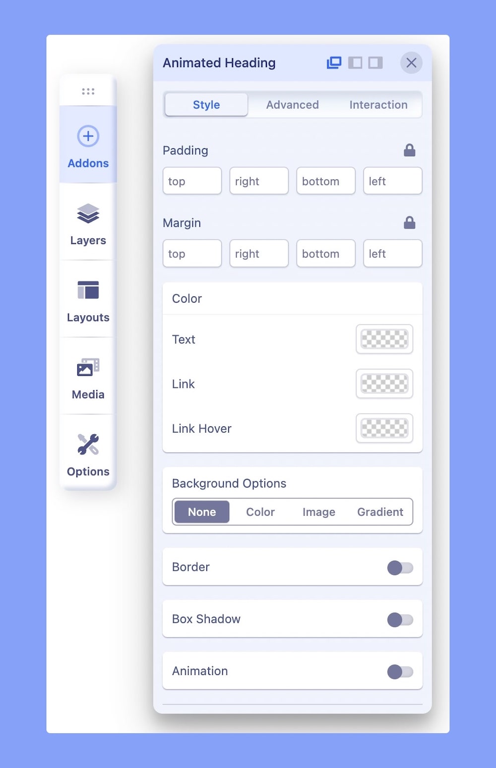 For every added addon, when you click on it an inline editor appears. There you will find the tools for accessing the styling options of the addon. The options are addon specific and we have in-depth documentation for every addon in the Addons section.