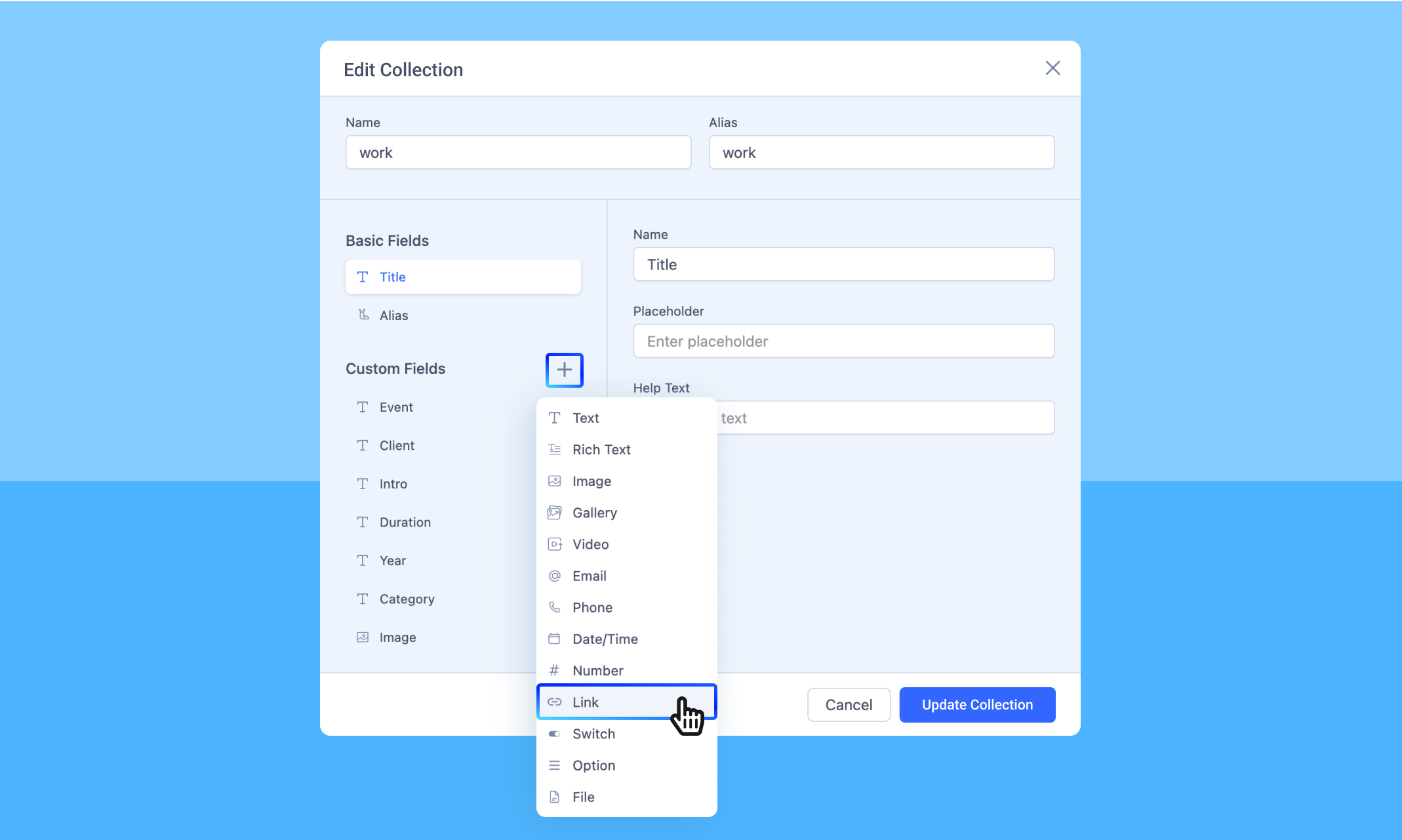 4. Set the Collection Source to the one that includes your Link field. For example, we'll set the source to "Works", since the Link fields are included within the Works collection.