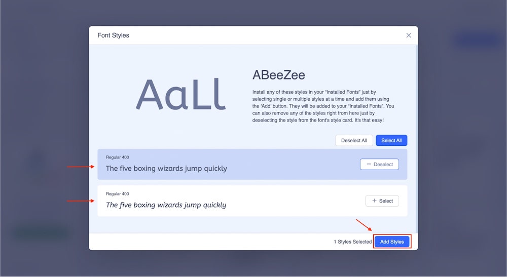 Now search for your desired Google Font and click on the add button that shows up upon hovering. Select your font style and hit Add Styles.
