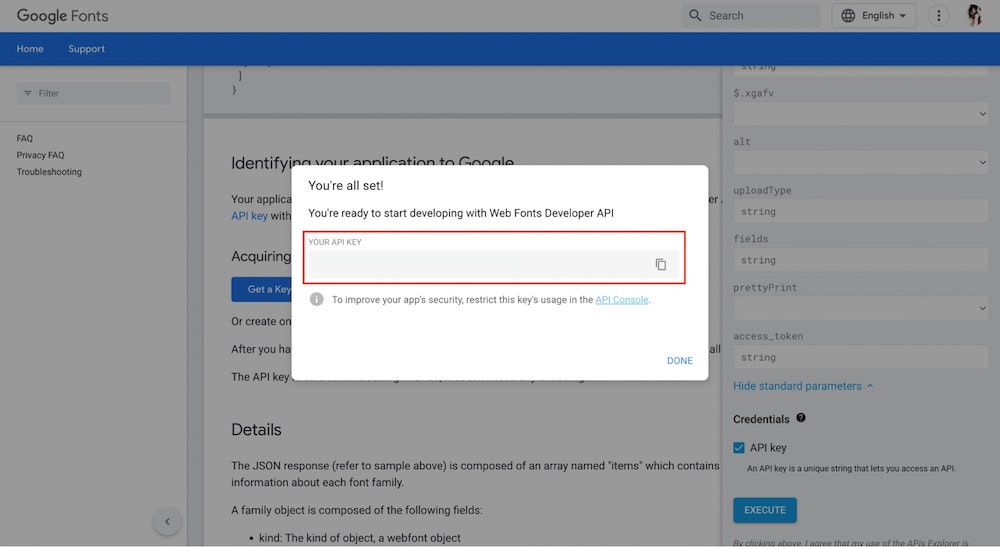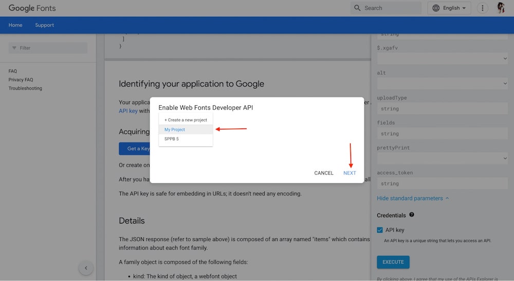 To upload your Google Fonts go to https://developers.google.com/fonts/docs/developer_api and scroll down to locate the “Get a Key” section. Click on the “Get a Key” button and choose your project.
