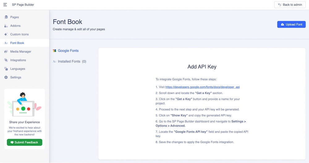 Now go back to the SP Page Builder 5 dashboard and navigate to Settings > Advanced. Locate the Google Fonts API Key field and enter the copied API Key. Save the changes and go back to the Font Book option. You should be able to see your Google Fonts loaded at this point.