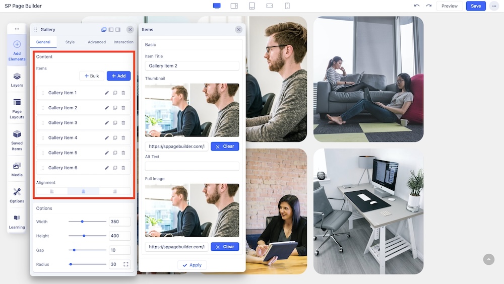 You can choose the best alignment for your gallery items. You can choose from Left, Right, and Middle alignment options.