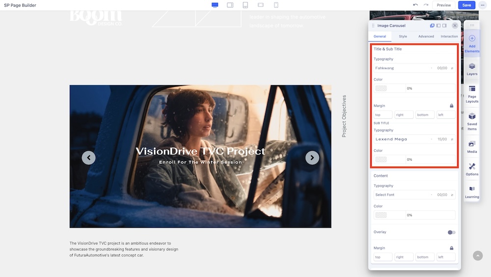 Typography: Adjust the fonts of the Title and Sub Title. Separate setting for both.