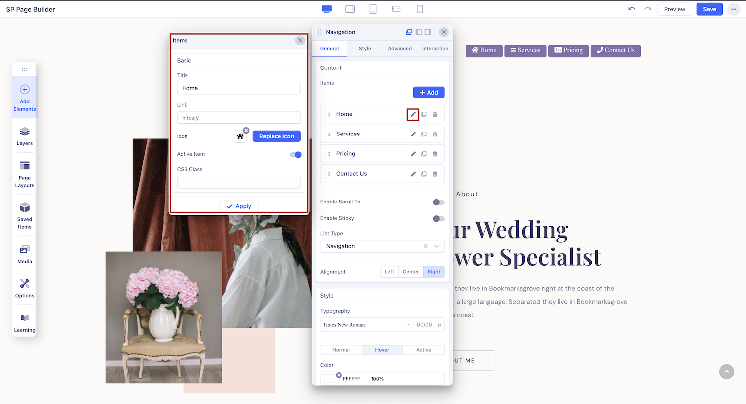 Click on the +Add button to add a new navigation item. Click on the edit icon beside the item to open the item editing panel.