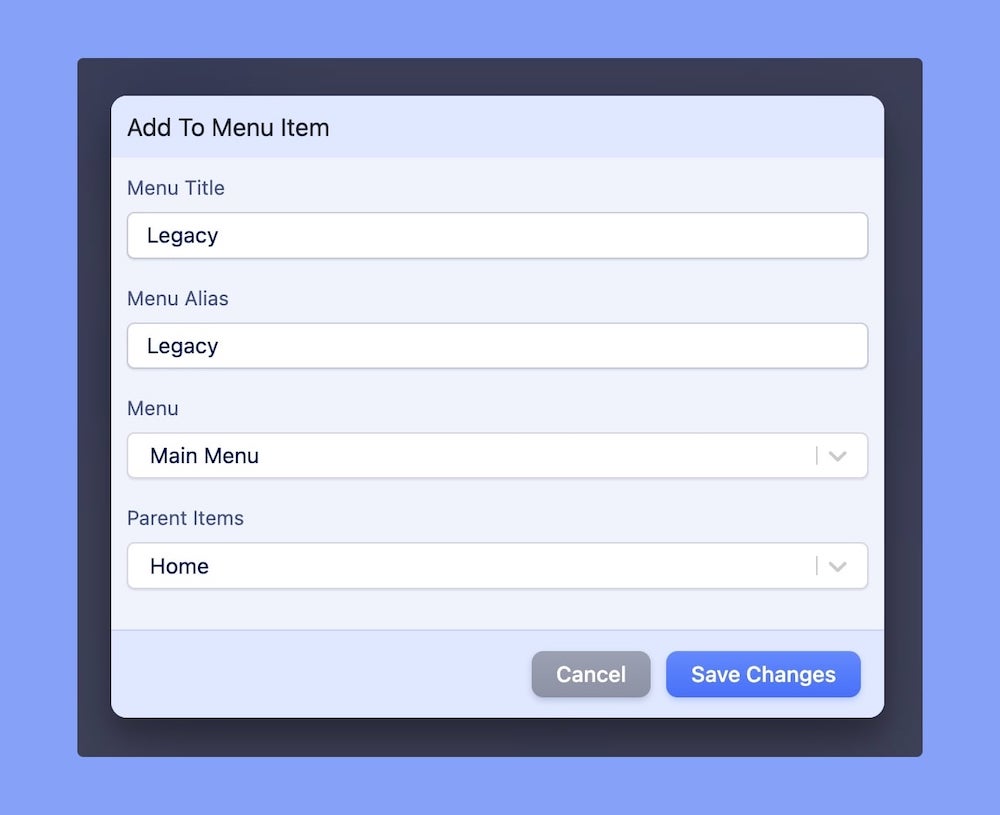 Enter the Menu Title, Menu Alias, Menu, Parent Items, and hit Save Changes. This will create a menu item assigning the page.