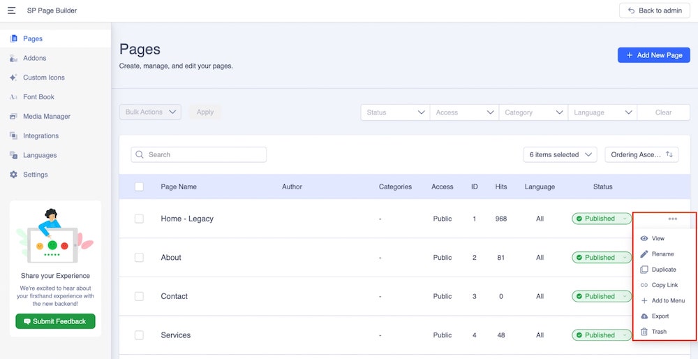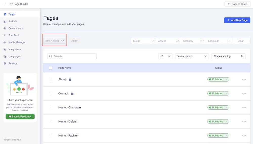 Core Joomla default features such as taking Bulk Actions, Sorting, Status, and Filter Options are also available on the SP Page Builder dashboard.