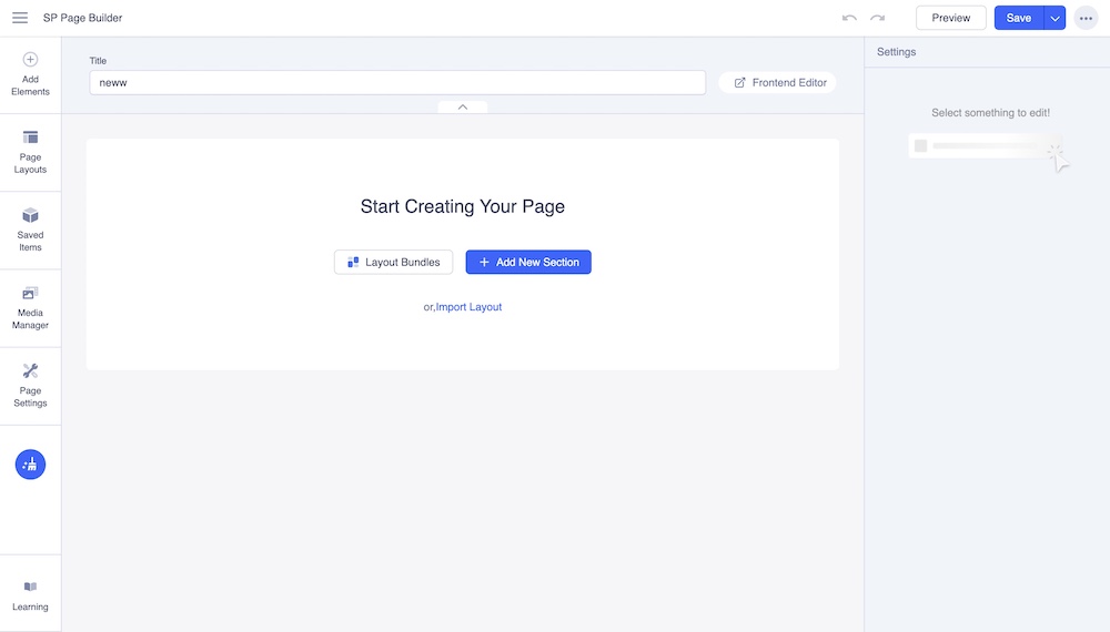 Give a title to your page and hit “Save & Go”. This will take you to editing mode where you can either import a predesigned layout bundle, a previously exported page layout or start designing your page from scratch.